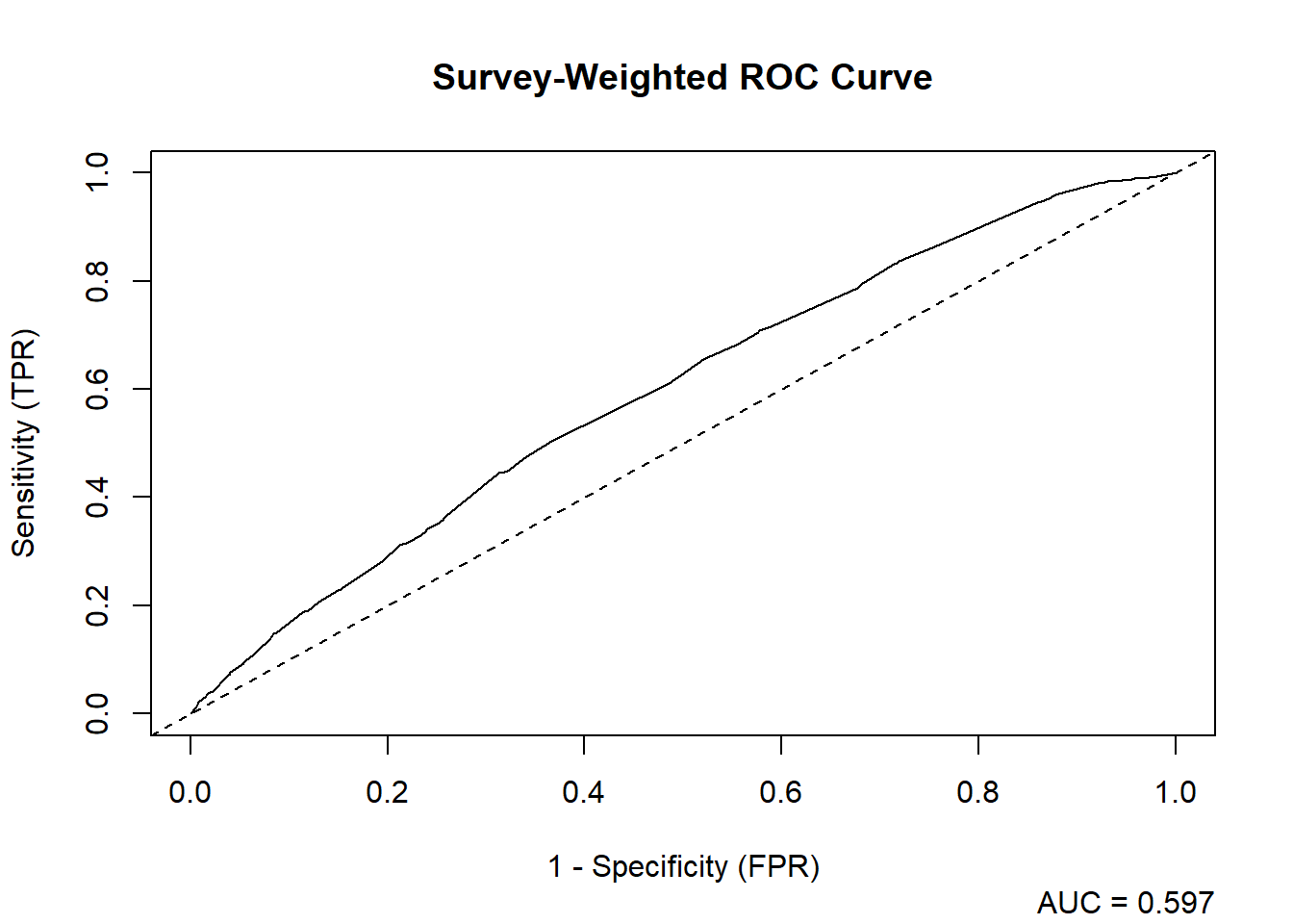 Interpretation: An AUC of 0.5967987 indicates poor discrimination. While better than simpler models, it suggests that the predictors do not have strong predictive power for obesity in this dataset.