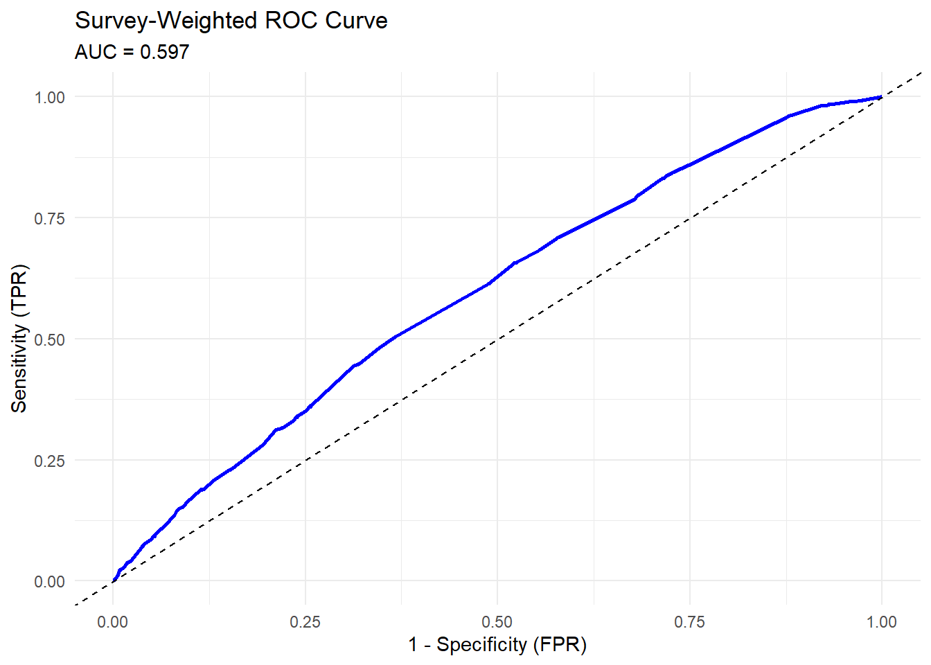 We calculate the Area Under the ROC Curve (AUC) to measure predictive performance. The svyAUC()