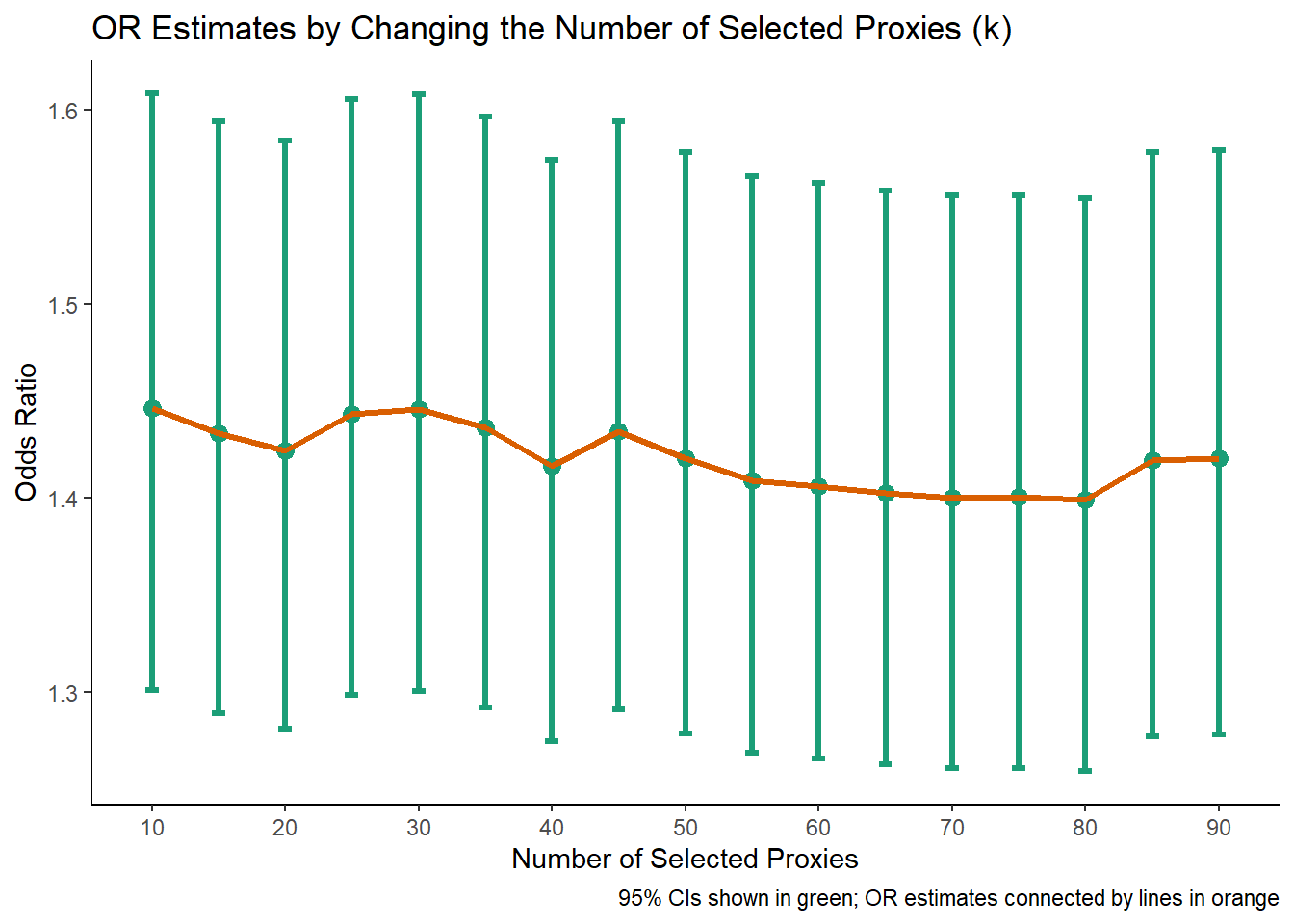 Hence we iterate the process (change k parameter in get_prioritised_covariates function in step 4) and obtain odds ratio (exponentiation of log-OR) for each k. We varied k from 10 to 90.