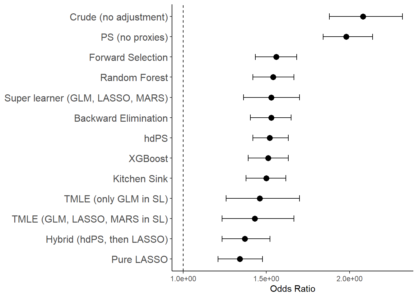 Across all methods evaluated—including hdPS, regularized regression (LASSO, Hybrid), ensemble learners (Super Learner, TMLE), and high-dimensional variable selection strategies (e.g., Kitchen Sink, Random Forest, XGBoost)—adjusted odds ratios ranged from 1.34 to 1.56, with most clustering between 1.50 and 1.56. In contrast, unadjusted and PS-only models produced substantially higher ORs (>1.9).