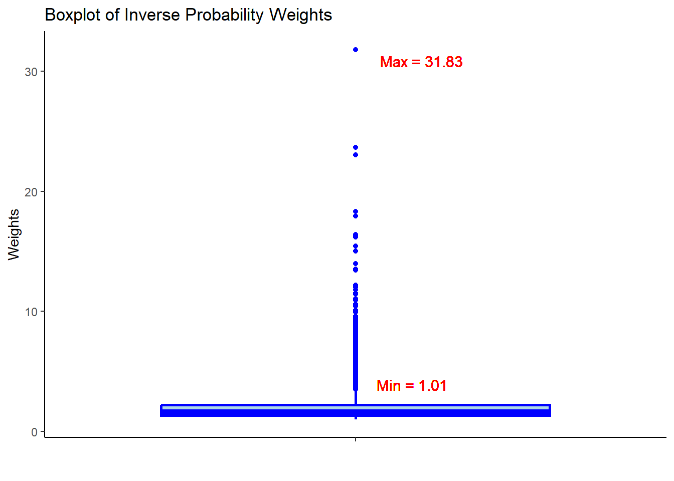 ggtitle("Boxplot of Inverse Probability Weights") +
