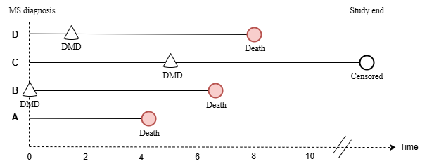- In the MS example, immortal time can occur if patients must survive long enough to receive a DMD, which could falsely enhance the perceived survival benefit of these drugs