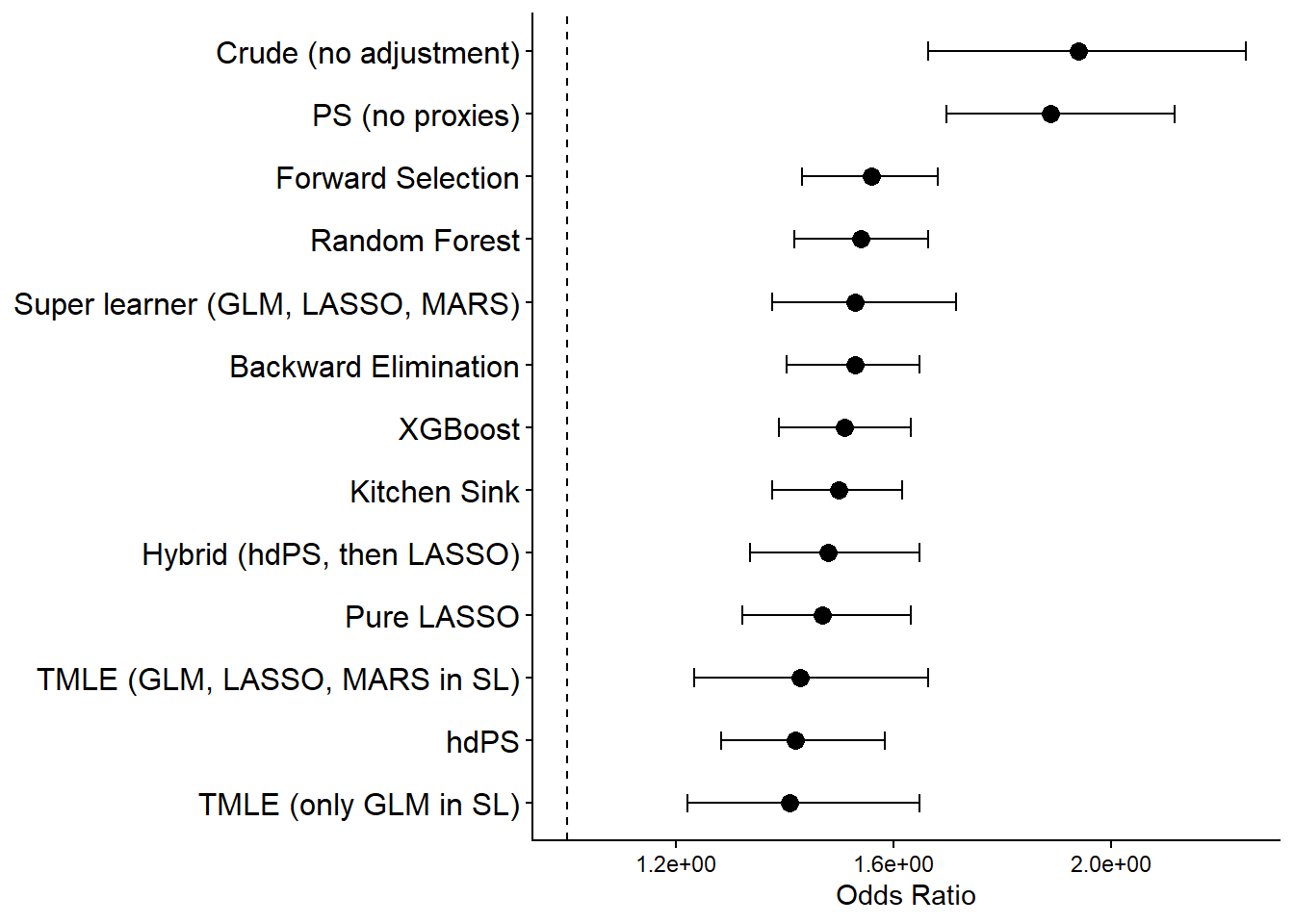 Across all methods evaluated—including hdPS, regularized regression (LASSO, Hybrid), ensemble learners (Super Learner, TMLE), and high-dimensional variable selection strategies (e.g., Kitchen Sink, Random Forest, XGBoost)—adjusted odds ratios ranged from 1.34 to 1.56, with most clustering between 1.50 and 1.56. In contrast, unadjusted and PS-only models produced substantially higher ORs (>1.9).