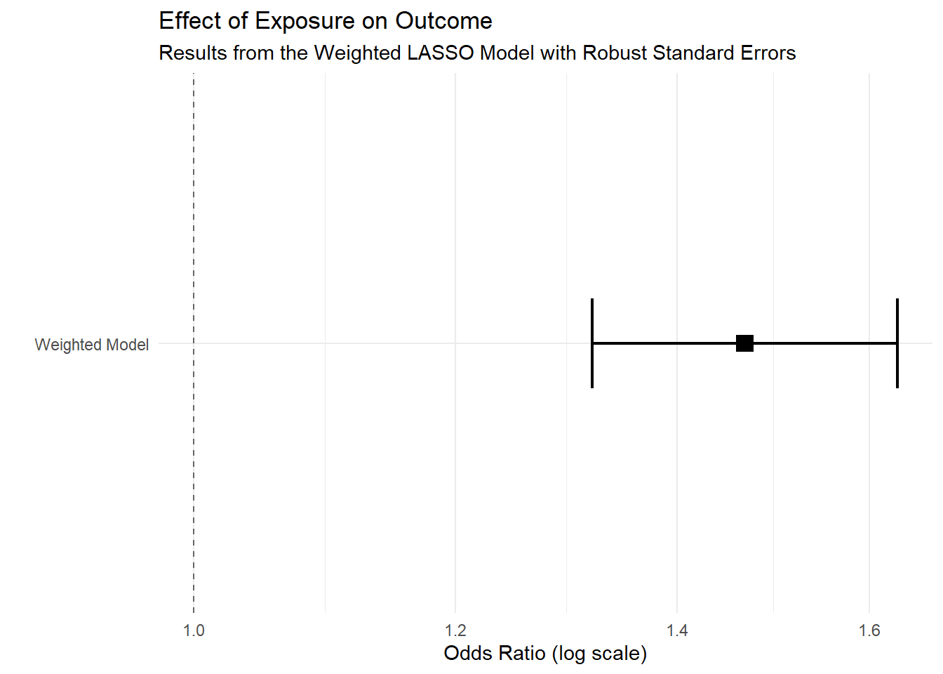 ps.formula <- as.formula(paste0("exposure", "~", rhsformula))Build propensity score model based on selected variables based on LASSO.
