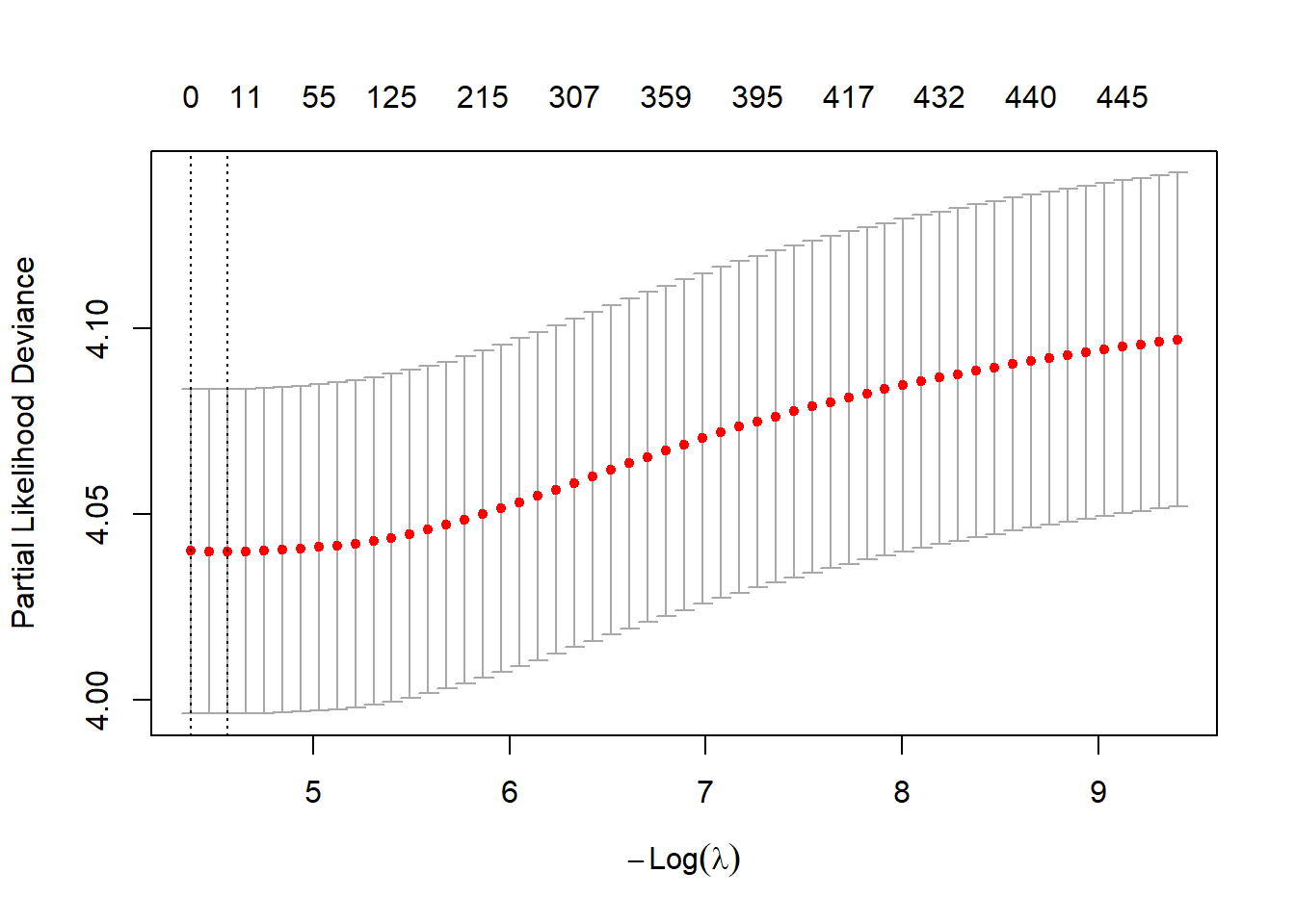 #> 442 11Since proxies were random and unrelated to the simulated data, LASSO produced only 11 non-zero coefficients. Let choose an arbitrary value as to demonstrate the process of variable selection.