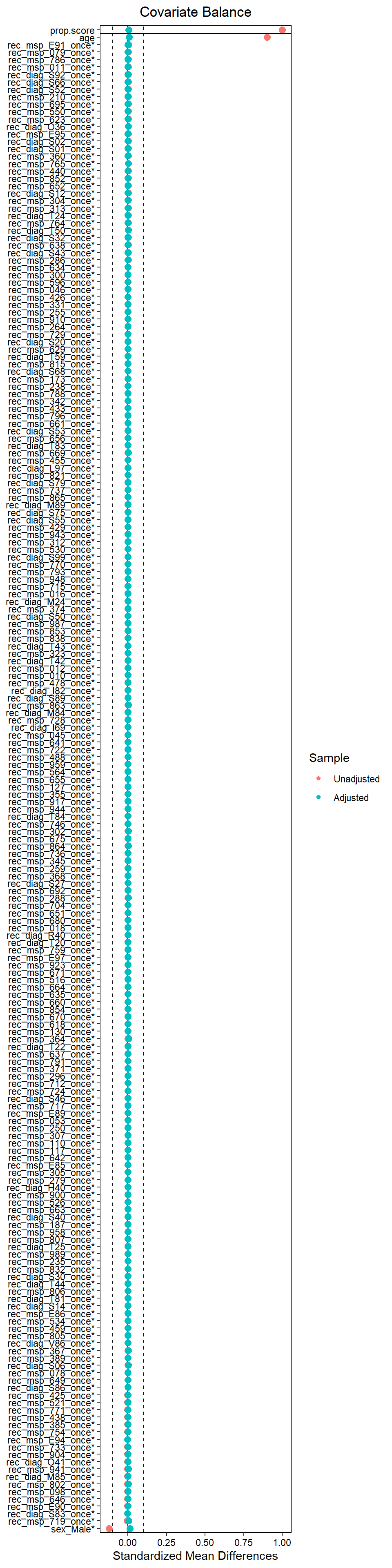 #> [4] "rec_diag_O41_once" "rec_msp_793_once" "rec_msp_459_once"25.3.7 Step 6: Propensity score