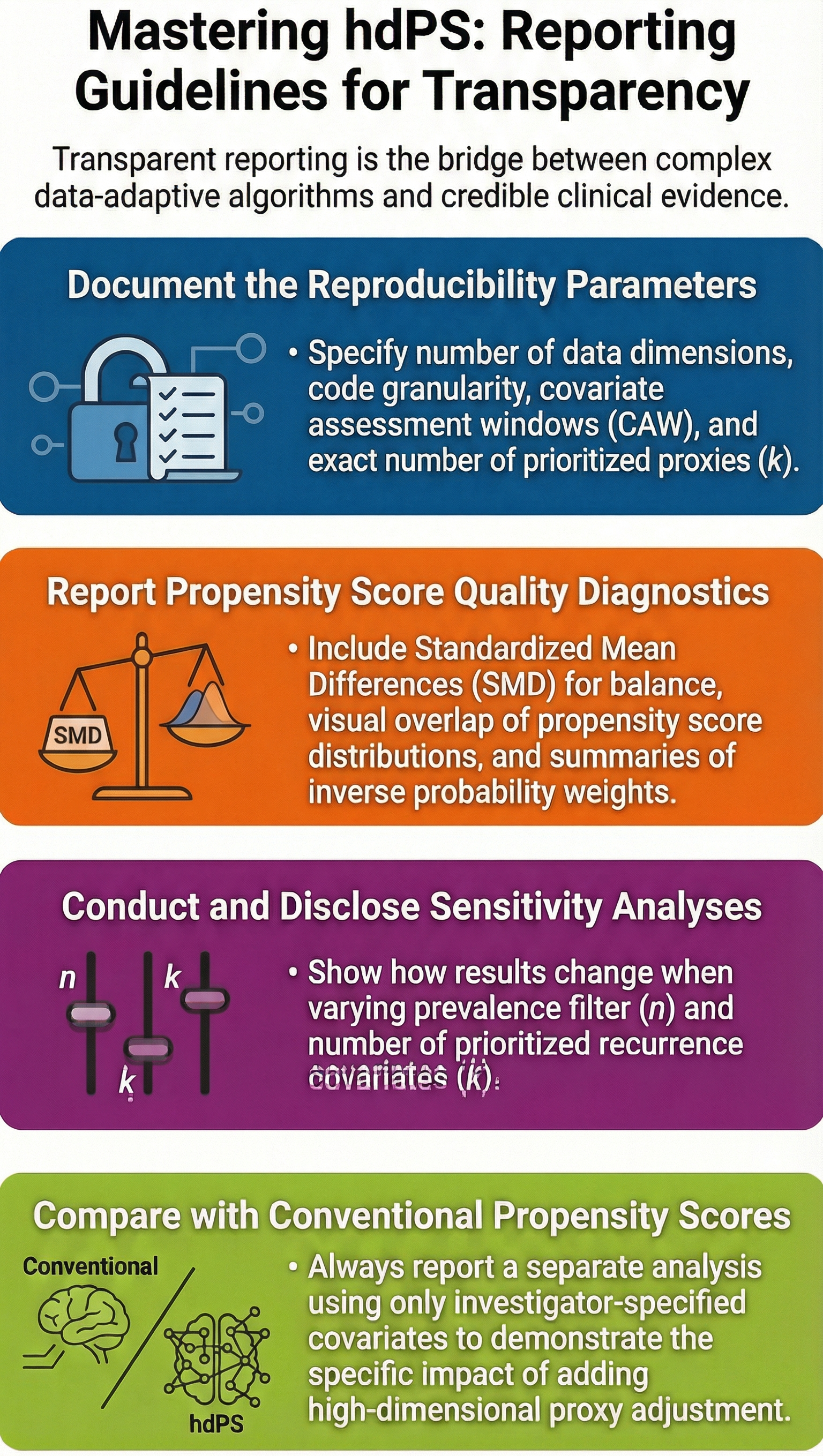 Many reporting guideline already exists about what to report in a propensity score analysis. Most of the reporting guideline should be applicable in the hdPS context as well. On top of those, we also need to consider reporting the following information about hdPS for transparency.