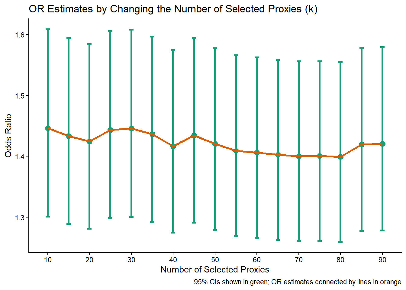 Hence we iterate the process (change k parameter in get_prioritised_covariates function in step 4) and obtain odds ratio (exponentiation of log-OR) for each k. We varied k from 10 to 90.