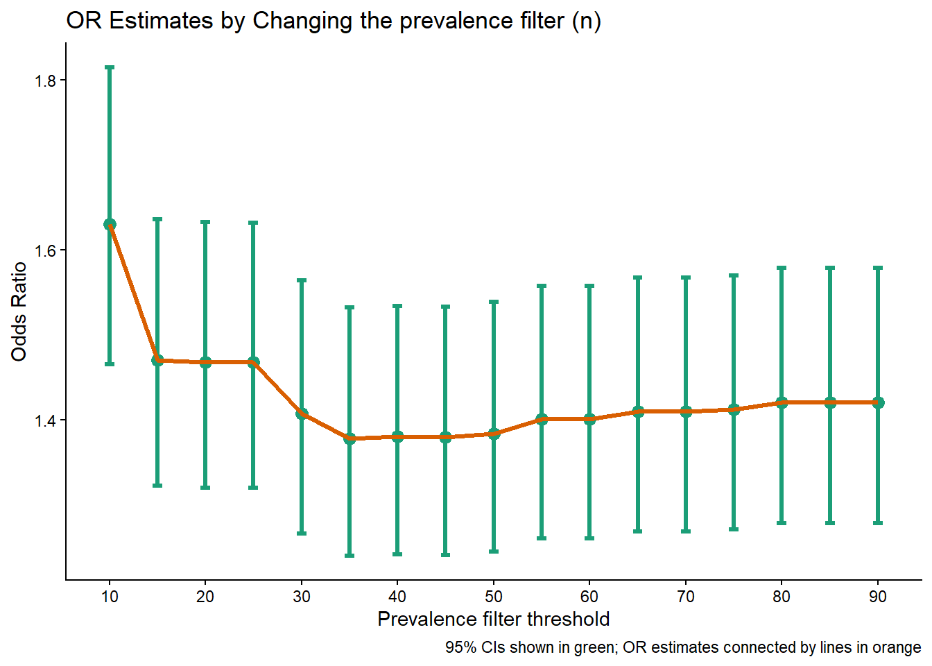 Hence we iterate the process (change n parameter in get_candidate_covariates function step 2) and obtain odds ratio (exponentiation of log-OR) for each n. We varied n from 10 to 90.