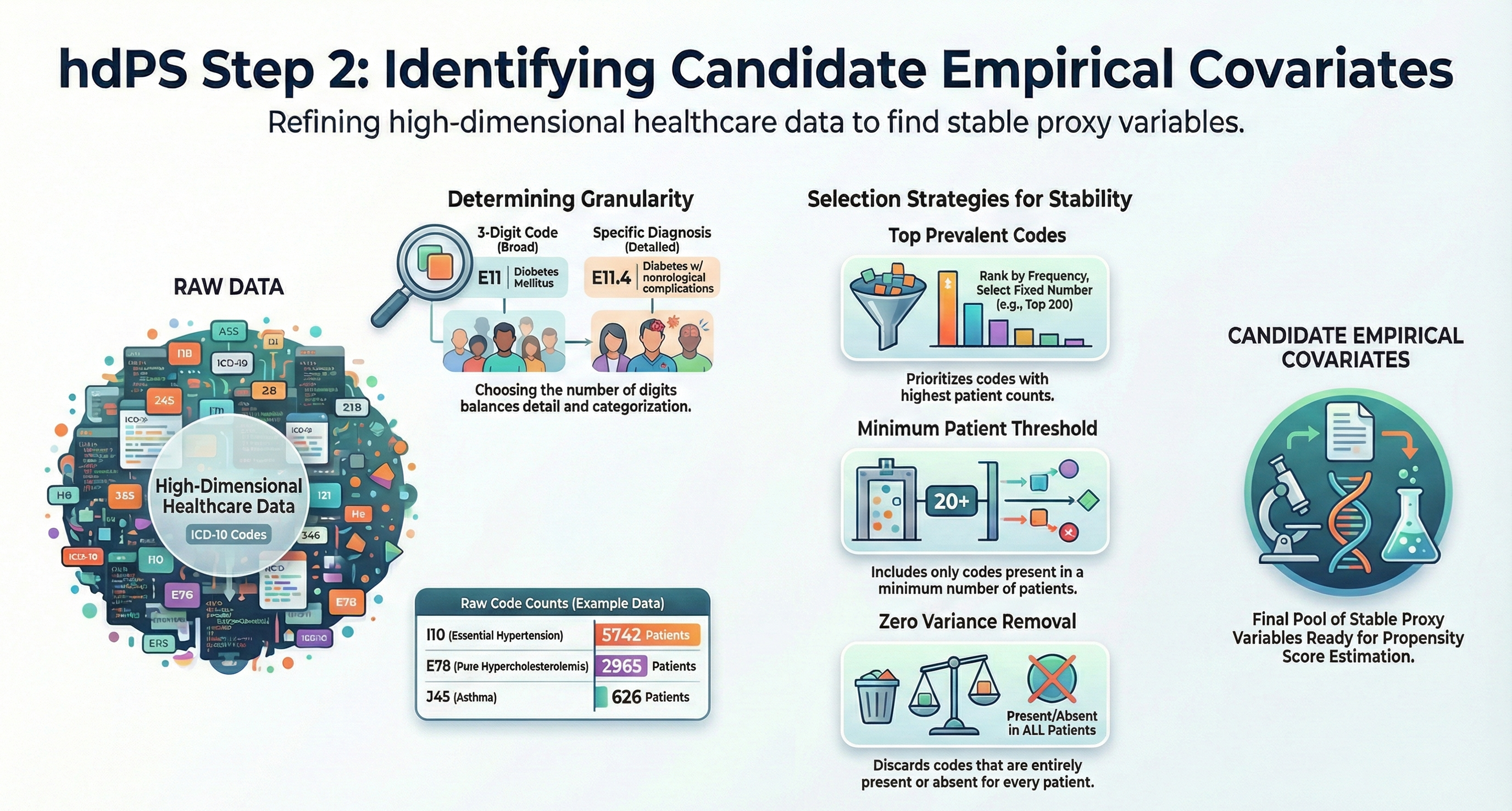 Following the identification of data sources in Step 1, this step focuses on refining the specific codes (proxies) to ensure they are frequent enough to provide reliable statistical estimates.