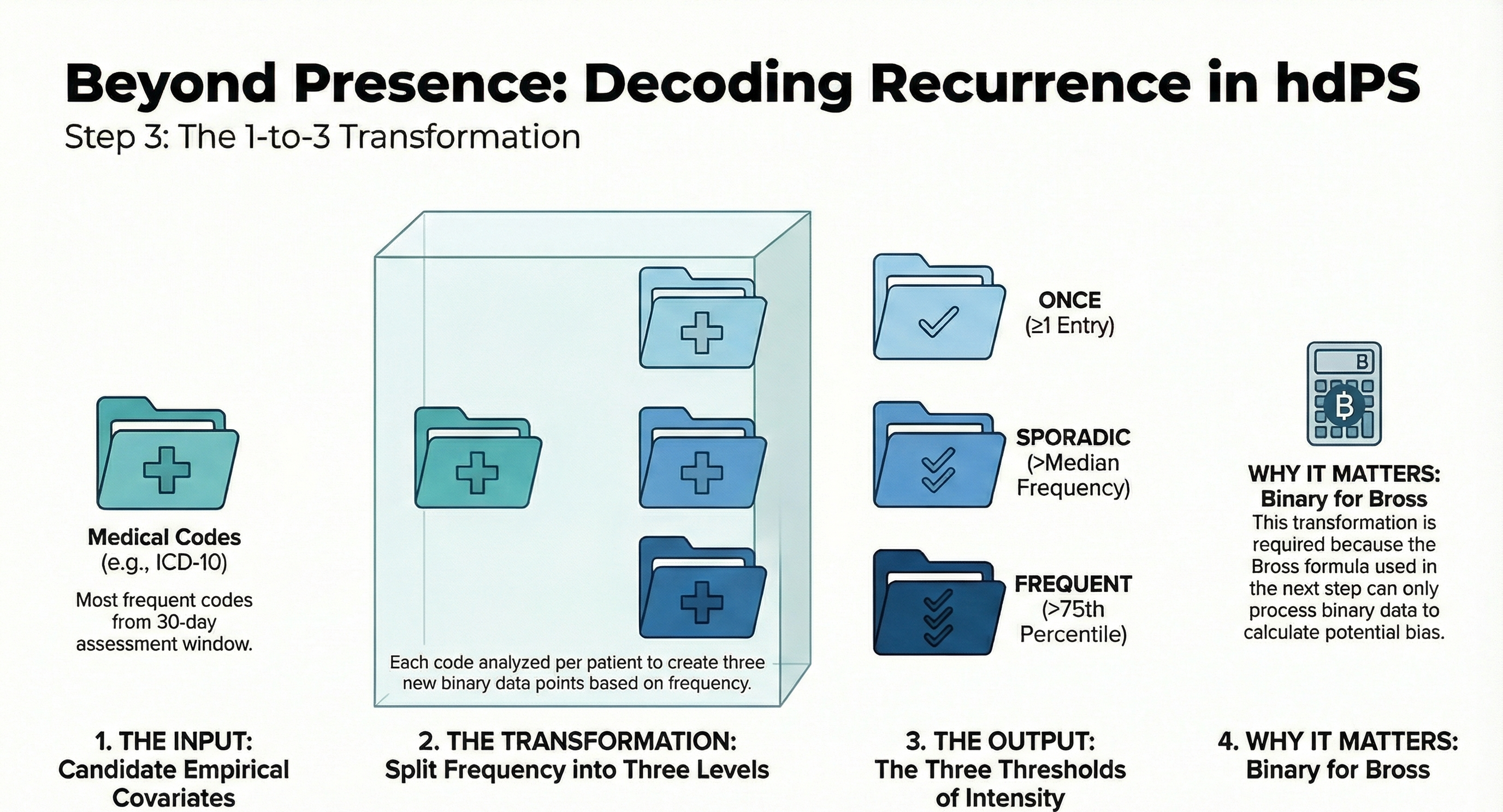 Output: Instead of simply recording that Patient A had “2 counts of anemia,” the hdPS algorithm assigns them three binary flags for this specific condition: