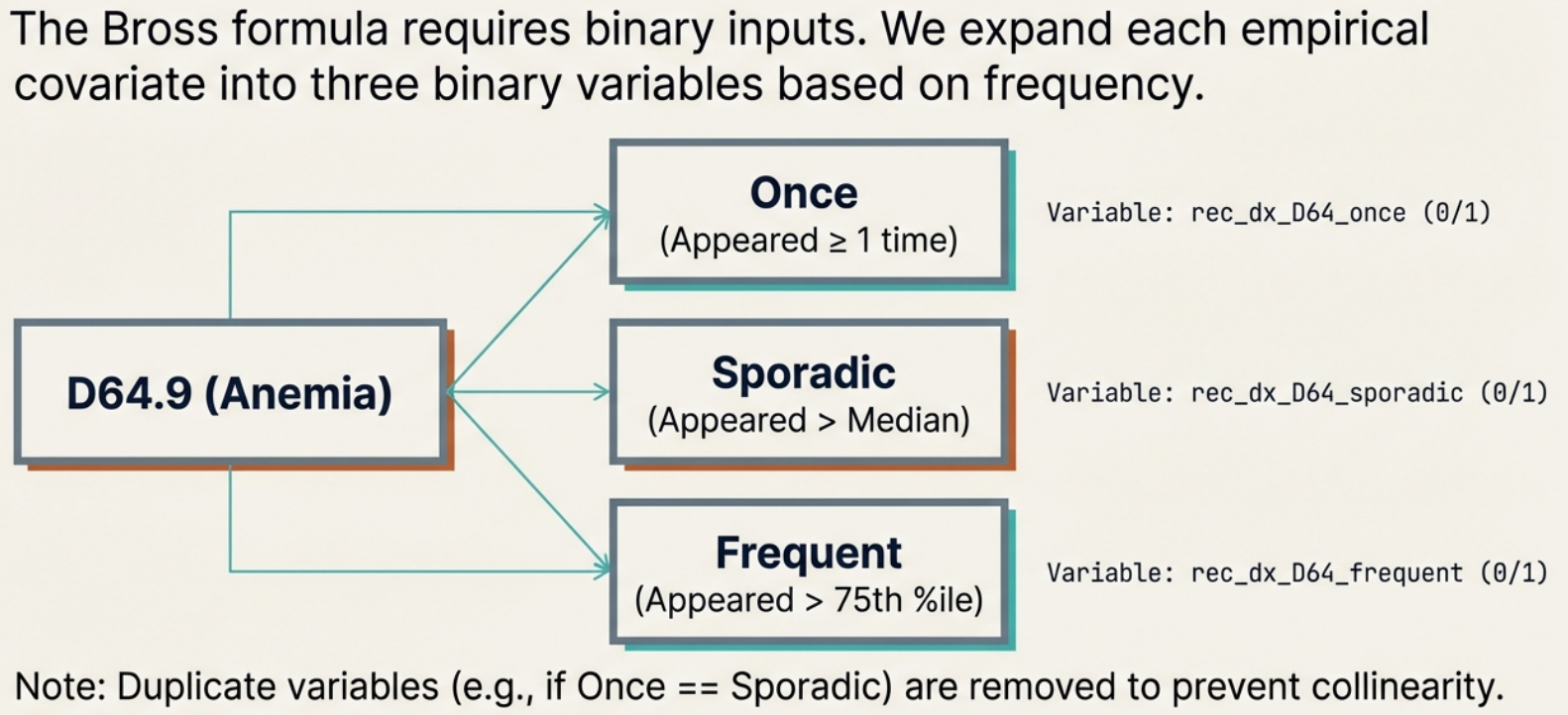 The Goal: The algorithm must convert the simple count of how many times a patient had an anemia diagnosis into binary (Yes/No) variables. This is necessary because the Bross formula used in the next step requires binary inputs.