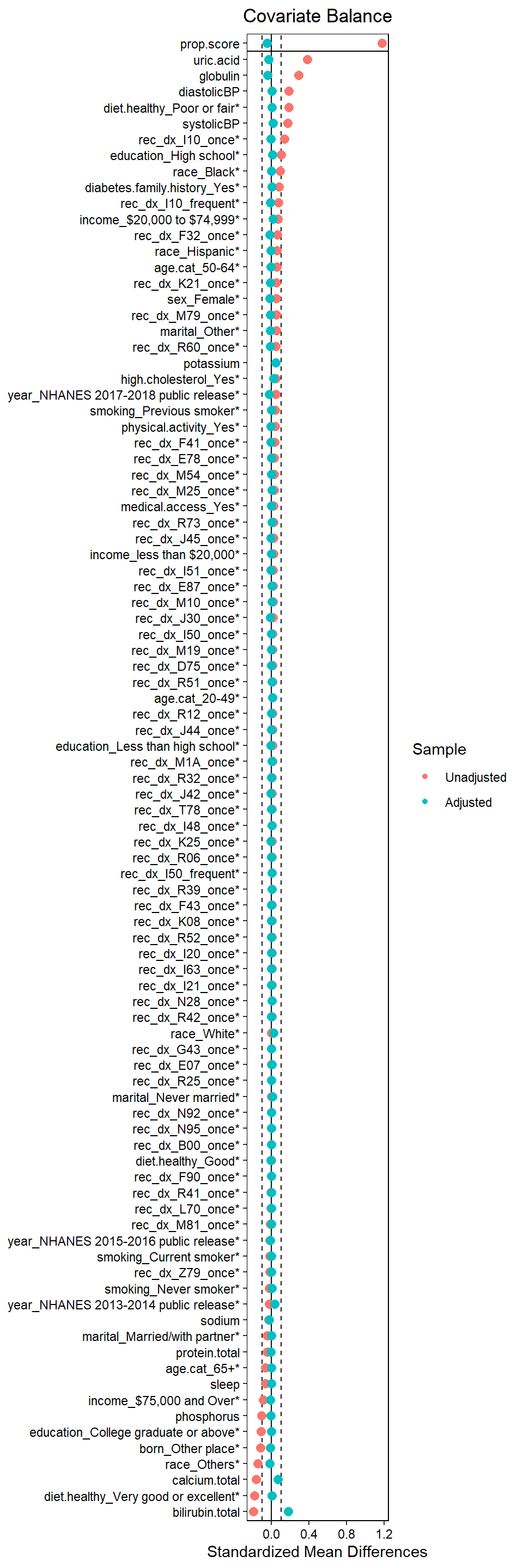 Always a good idea to assess balance. Here we are measuring against SMD 0.1. Use love.plot function from the cobalt package. See more descriptions of balanced diagnostics elsewhere for a propensity score context.