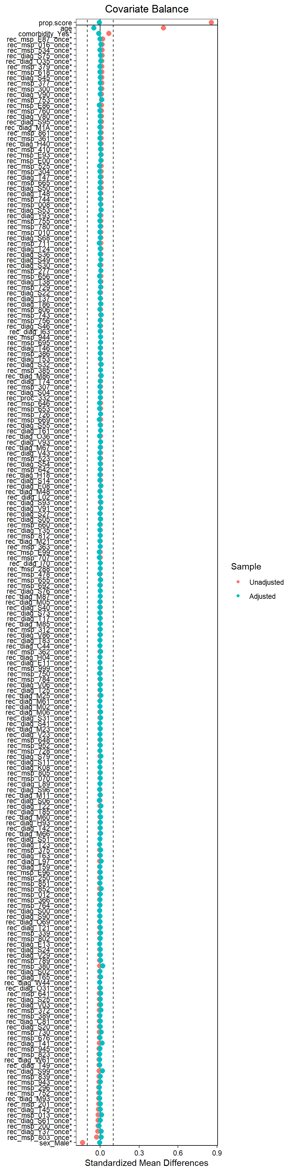 #> [4] "rec_diag_V03_once" "rec_diag_S24_once" "rec_diag_W61_once"22.7 Step 6: Propensity score