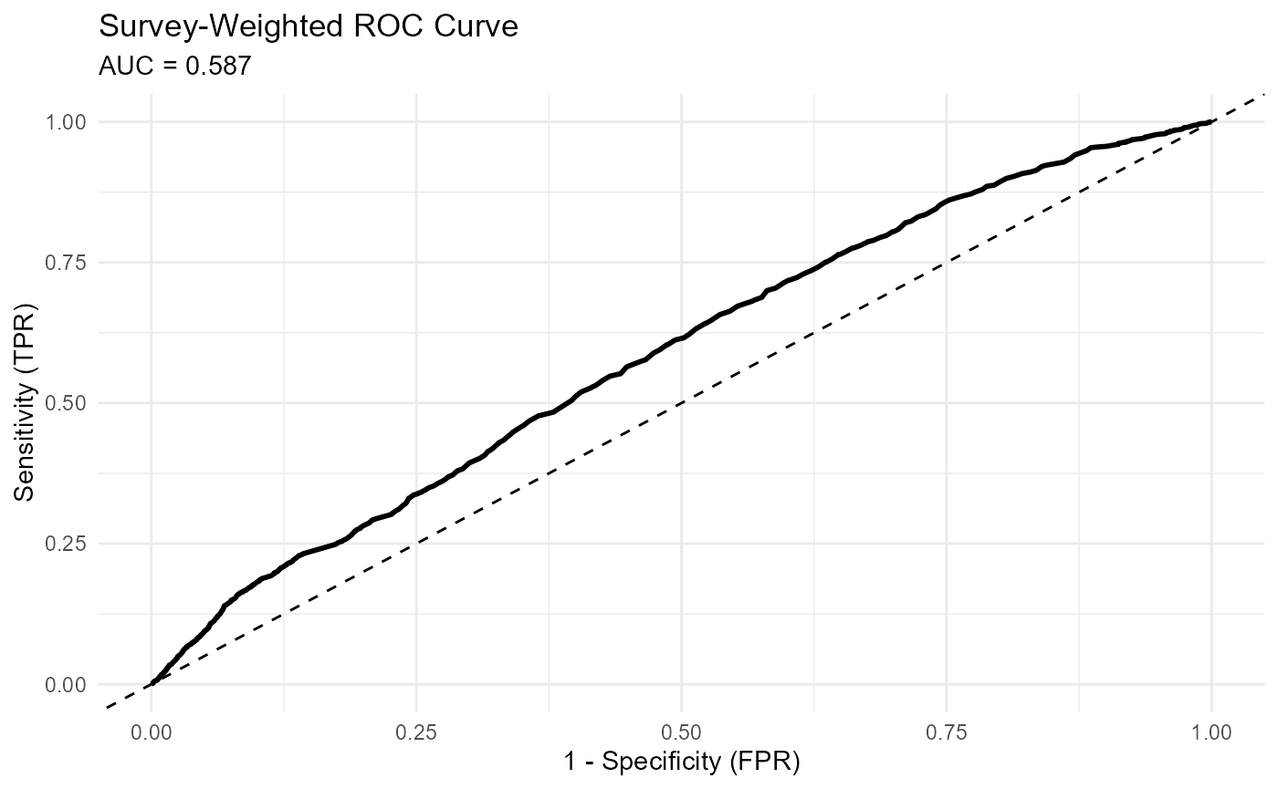 svyAUC(): Computes design-correct AUC for predictive performance.