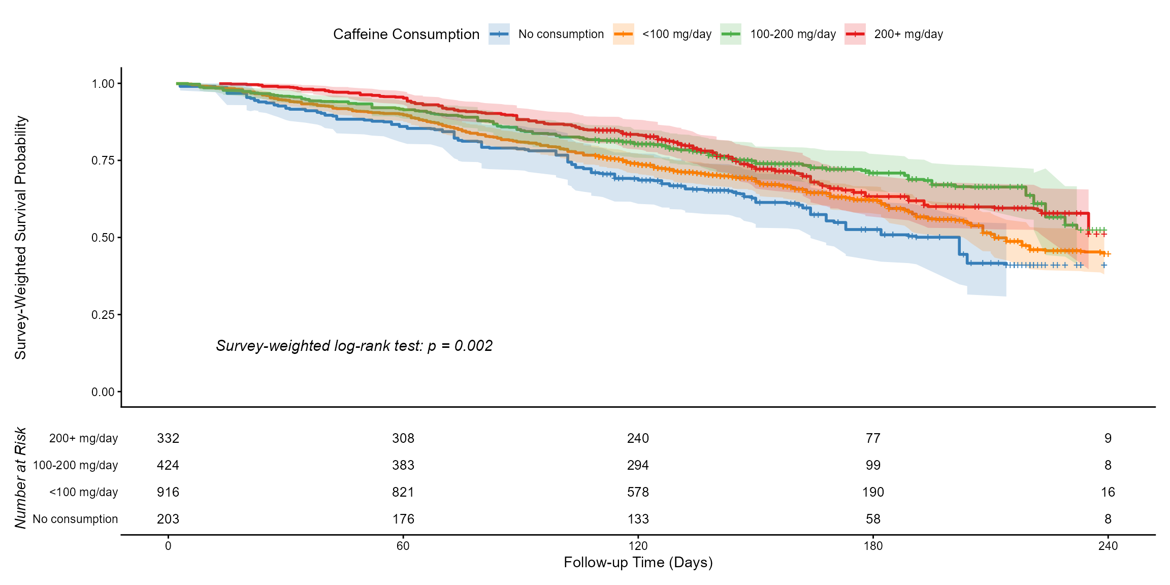 The example below uses the NHANES linked mortality file to compare survival across levels of caffeine consumption among women.